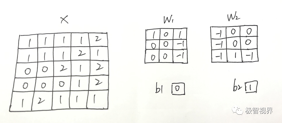 具体来讲,对于只有一个通道的输入特征图矩阵 X(5 x 5),现在共有两个卷积核,其中卷积核1的权重为 W1,b1偏置中的所有元素为0;卷积核2的权重为 W2,b2偏置中的所有元素为1;两个卷积核的权重都是 3 x 3 的矩阵,卷积核移动的步长为2,pad 为1。