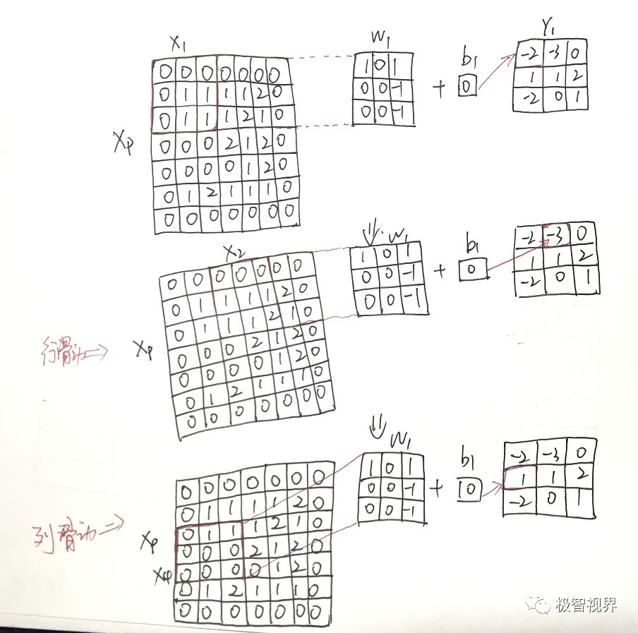 正式计算时,权重 W1 在 Xp 矩阵中的初始位置 X1 开始计算,将权重元素与 Xp 中输入特征子矩阵 X1 处的所有元素进行对应的点积操作,再加上偏置后得到输出特征矩阵 Y1 的第一个元素的值 -2,其计算过程是:0 x 1 + 0 x 0 + 0 x 1 + 0 x 0 + 1 x 0 + 1 x (-1) + 0 x 0 + 1 x 0 + 1 x (-1) + 0 = -2。计算完成 Y1 的第一个元素后开始行滑动计算,权重 W1 矩阵向右滑动2个元素的步长,这时权重 W1 与 矩阵 Xp 中输入特征子矩阵 X2 重叠,进行对应元素的点积并加上偏置,得到输出特征矩阵 Y1 的第二个元素的值 -3。以此类推,完成输出特征矩阵 Y1 的第一行的所有元素的计算。在进行 Y1矩阵第二行的元素计算时,权重 W1 从输入特征子矩阵 X1 的位置垂直向下滑动 2个元素的步长,计算输出特征矩阵 Y1 中第二行的第一个元素值 1。卷积核移动的步长在输入特征图中的横向和纵向移动上都发挥着作用。由此经过9次的权重与输入特征子矩阵的点积运算后,得到输出特征图 Y1 的所有元素值。对于卷积核2可使用同样方法得到输出特征图 Y2。