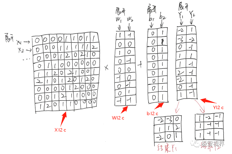 将输入特征图 Xp 通过 Img2Col 展开成新的矩阵 XI2c 的第一行,输入特征子矩阵 X2 展开成第二行,因为共有9个输入特征子矩阵,所有以此方法展开成 9 行,并生成最终的 XI2c 矩阵。同理,可将第 2 个卷积核的权重矩阵 W1、W2 按照列展开成矩阵 WI2c,偏置量矩阵 bI2c 也可以同样展开得到。接下来进行矩阵乘法运算,将 XI2c 的第1行 与 WI2c的第一列进行计算,再加上偏置便可得到 YI2c 的第1个元素值,依次计算下去得到整个输出特征矩阵 YI2c。