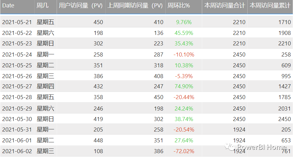 本周访问量累计 =VAR curWeekNum =SELECTEDVALUE ( '日期表'[年度周数] )VAR curDate =SELECTEDVALUE ( '日期表'[Date] )RETURNCALCULATE ([用户访问量(PV)],FILTER ( ALL ( '日期表' ), '日期表'[年度周数] = curWeekNum && '日期表'[Date] <= curDate ))