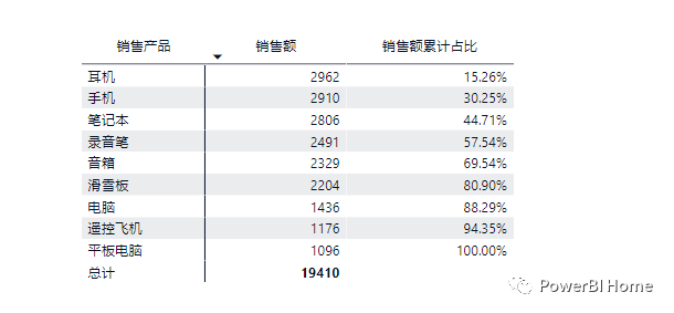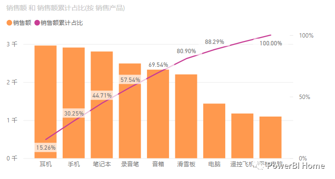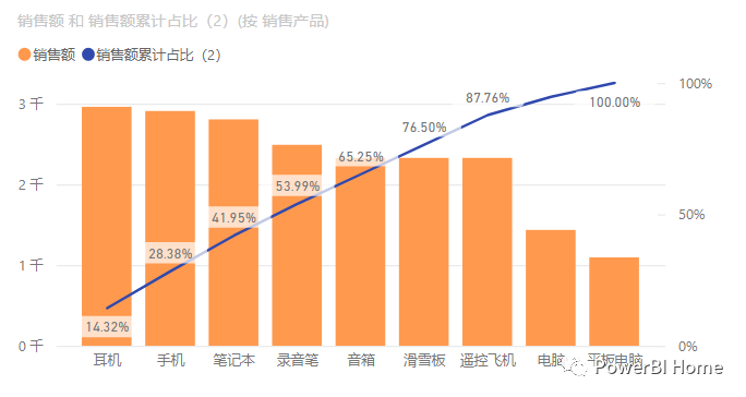 首先,我们看下正常情况下的表达式写法和实现后的效果。x轴代表的是不同的产品,左侧y轴代表的是对应产品的销售额,右侧y轴代表的是对应产品之前(含当前产品)销售额累计占整个销售额的比例。一般来说,我们可以通过这个分析来看公司哪些产品是核心产品,哪些是次核心,具体方法可以参考我之前的文章(PowerBI如何实现产品的ABC分析)很明显,如果我们想知道哪些产品贡献了企业里80%的销售额,这里我们可以很清晰的定位到耳机——滑雪板的销售额合计贡献企业80%的份额,换句话说,这部分产品是公司的核心产品。