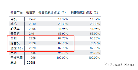小伙伴,大家好!今天给大家分享的是一个会员朋友的提问,他想在Power BI里面绘制帕累托图,但是,遇到一个比较奇怪的问题:多个产品的销售额都一样,这样我们在计算累计判断的逻辑就有点问题了,这个并不是DAX计算错误,只是计算逻辑不符合我们的需求而已。