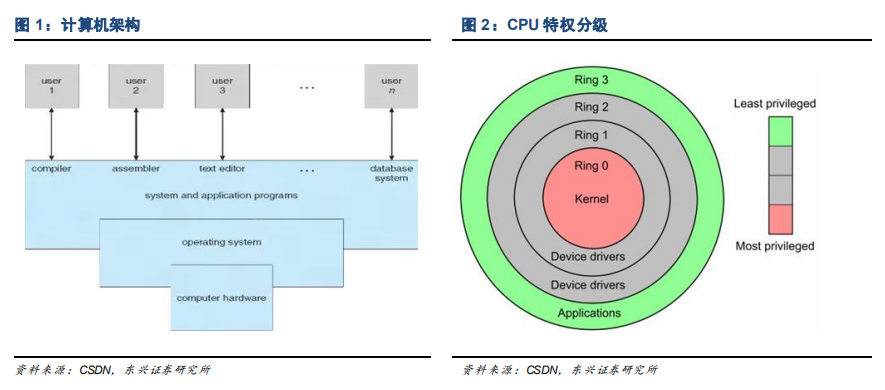 Intel 的 CPU 将特权级别分为 4 个级别:RING0、RING1、RING2、RING3;Windows 只使用其中的两个级别 RING0 和 RING3。操作系统(内核)的代码运行在最高运行级别 ring0 上,可以使用特权指令,控制中断、修改页表、访问设备等等。