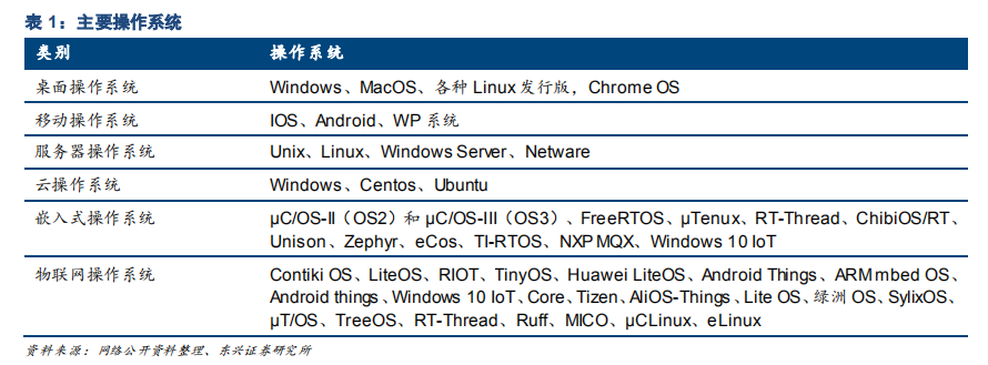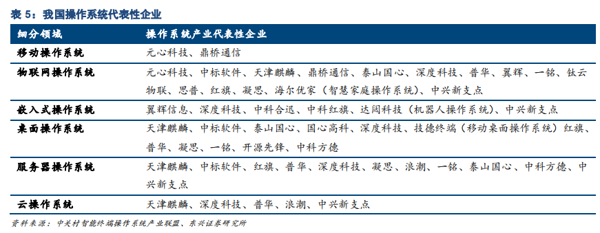 操作系统可细分为移动操作系统、物联网操作系统、嵌入式操作系统、桌面操作系统、服务器操作系统、云操作系统等领域,各细分领域均有其相对应的代表性企业。