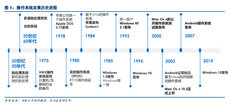 操作系统发展于上世纪中叶,经过单道批处理系统、多道批处理系统、分时系统、实时系统等几个阶段,发展出具有多种类型操作特征的通用操作系统。在此过程中,微软、苹果、谷歌等公司奠定了行业优势,成功在操作系统市场占有一席之地。