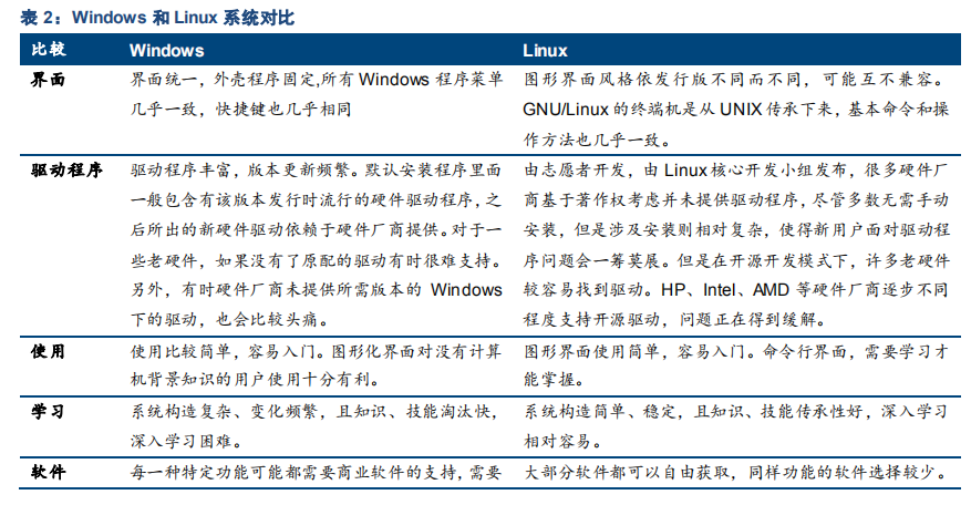 5)操作系统厂商从业人员相对较少,力量分散,专业化水平不足。