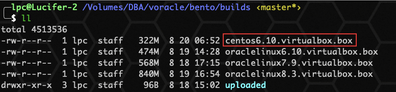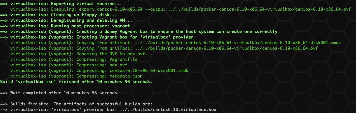 显示如上,即已经打包成功,box 位置存放在:../../builds/centos6.10.virtualbox.box 。