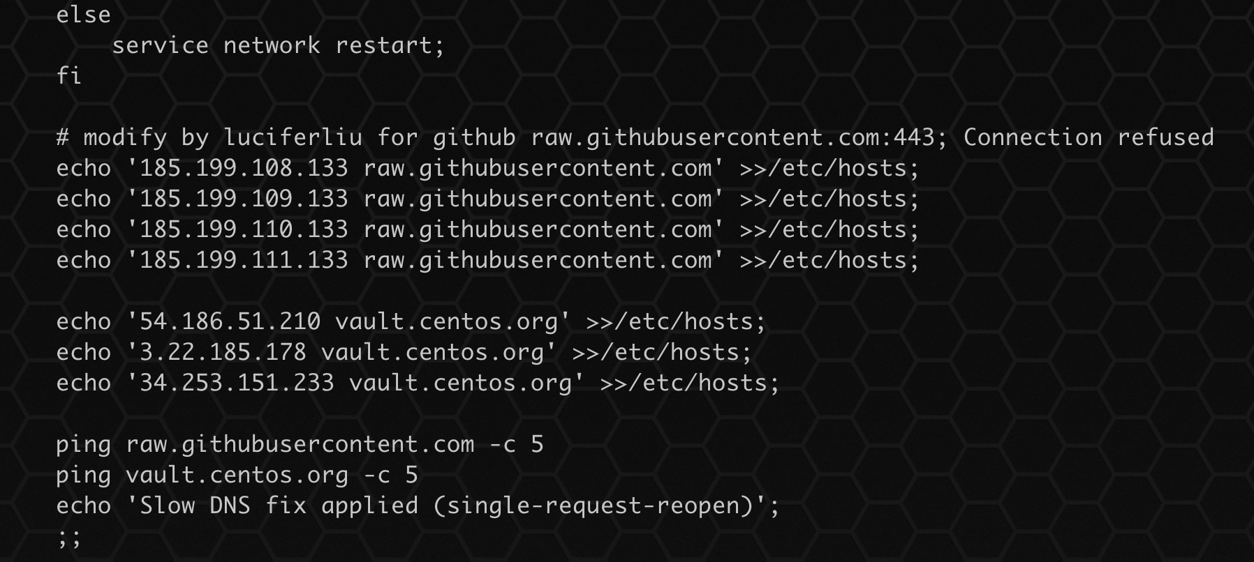 脚本位于 centos 中,../centos/scripts/networking.sh,由于无法访问 github ,因此 /etc/hosts 需要增加 github ip: