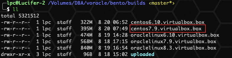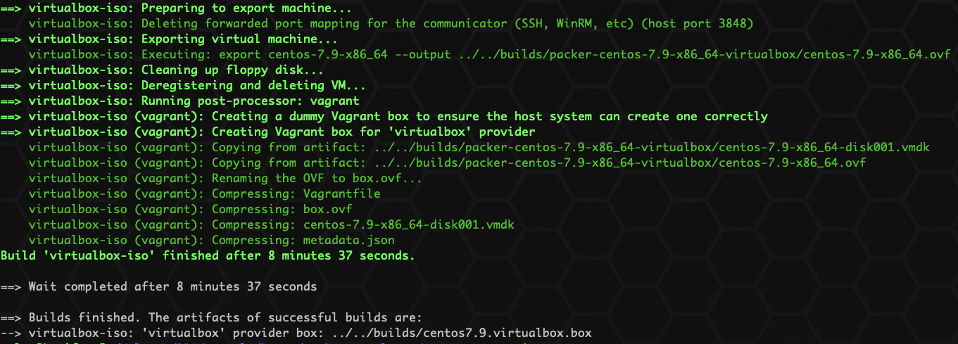 显示如上,即已经打包成功,box 位置存放在:../../builds/centos7.9.virtualbox.box 。