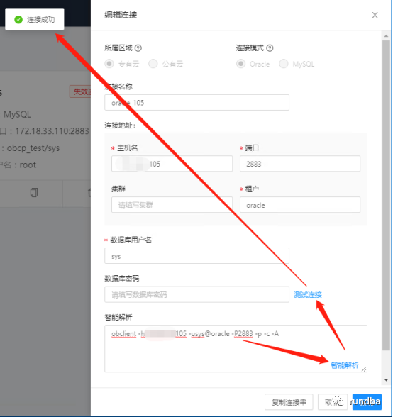 在“智能解析”区域,输入连接信息:obclient -h172.18.33.105 -usys@oracle -P2883 -p -c -A,点击“只能解析”,点击“测试连接”,提示连接成功,点击保存。