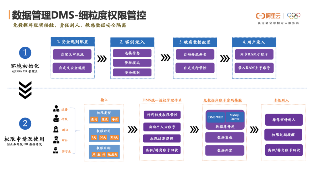 相比较于传统数据库访问方式在数据库上创建多个账号的方式,阿里云****数据管理DMS提倡统一管理入口,仅需要给DMS创建一个专用账号,避免所有人员直接接触数据库账号密码,所有访问都通过产品按需申请、流程审批开通使用。