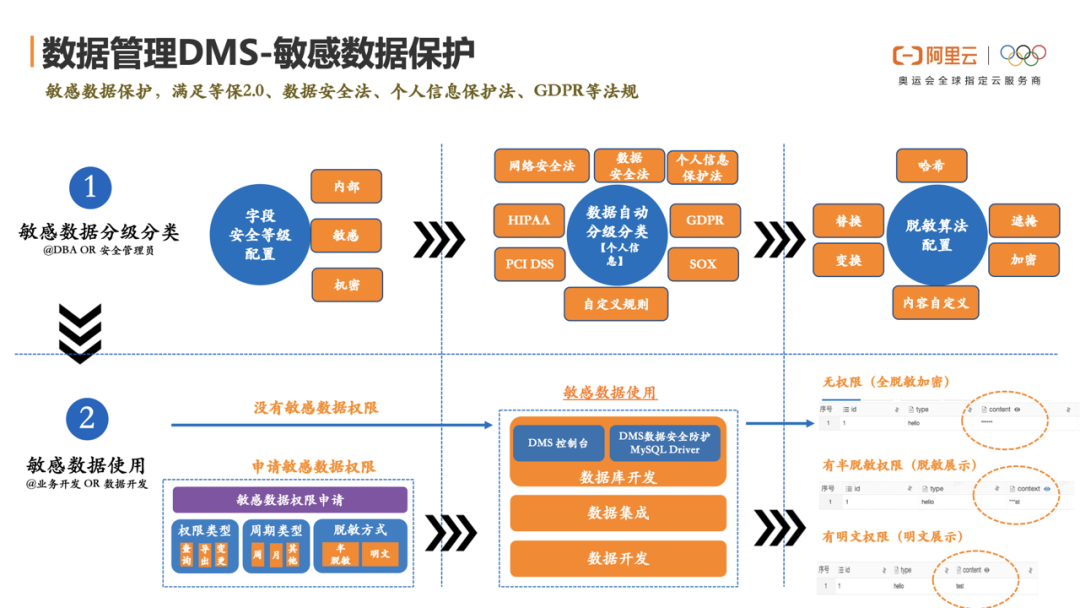 目前DMS产品内支持通过规则扫描字段命名或者抽样少量数据内容进行分类识别打标,针对打标好的敏感、机密字段有又可以统一设置各种加密算法,在查询时即使已经有了库、表权限,针对此类字段还需要额外申请字段权限才可以使用,否则对应字段会被加密,并且无法作为查询条件进行数据的过滤提取。