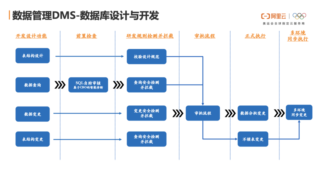 这里额外提一下,目前DMS内置了阿里巴巴内部运行的安全规范,同时企业也可以根据不同的业务按需定义符合企业的最佳安全规范,支持通过DSL语言扩展定义;凡是不满足规范定义内的操作,DMS均会拦截。