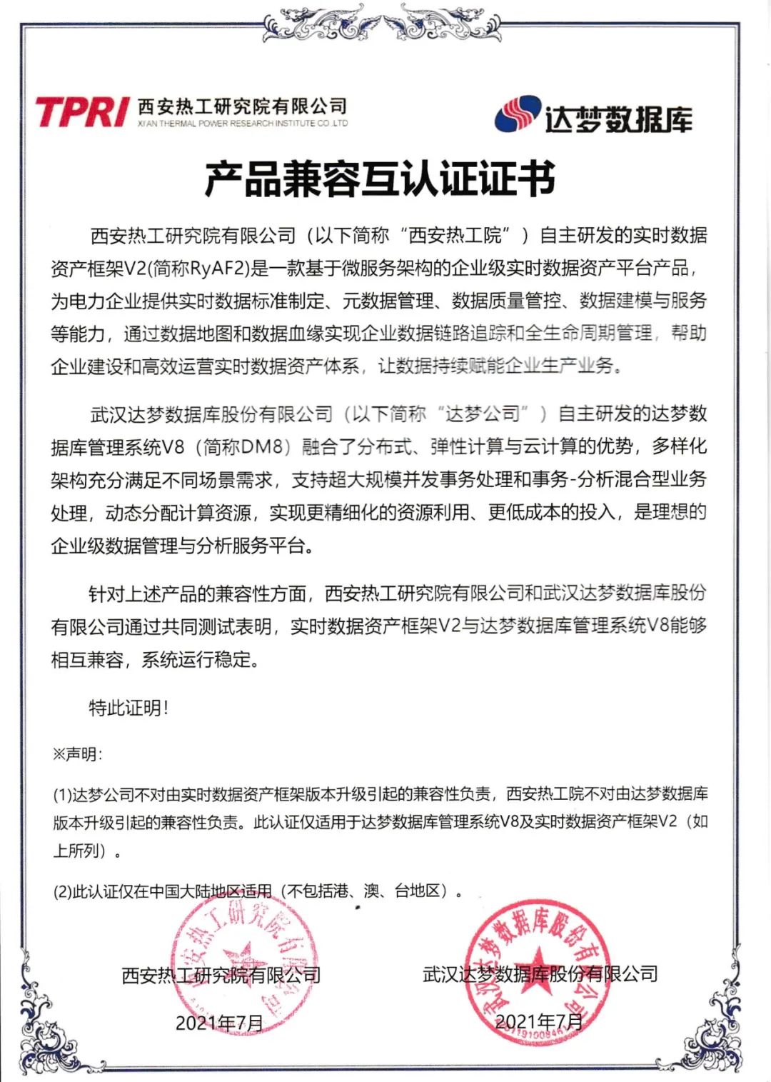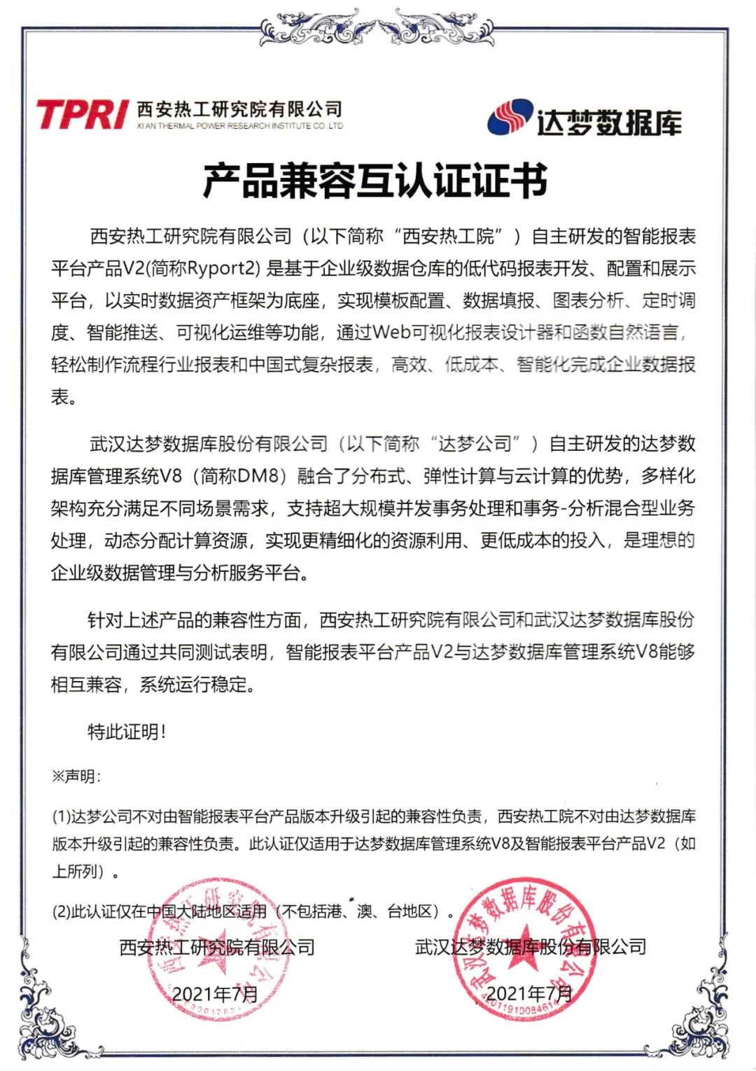 近日,武汉达梦数据库股份有限公司(以下简称“达梦公司”)DM8产品与西安热工研究院有限公司(以下简称“西安热工院”)RyAF2、Ryport2产品完成了兼容认证测试。测试结果表明,双方产品相互兼容,系统运行稳定。
