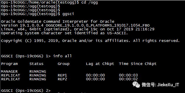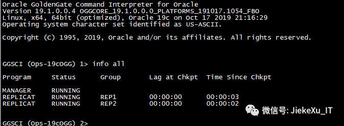 GGSCI (Ops-19cOGG) 10> info allProgram Status Group Lag at Chkpt Time Since ChkptMANAGER RUNNINGREPLICAT RUNNING REP1 00:00:00 00:00:03REPLICAT RUNNING REP2 00:00:00 00:00:02
