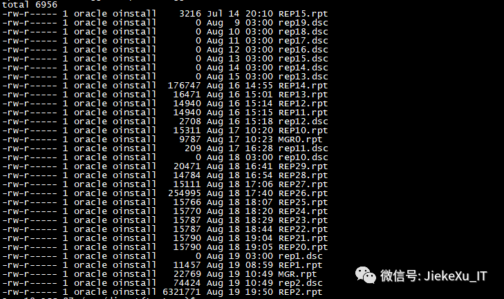 total 6932-rw-r----- 1 oracle oinstall 3216 Jul 14 20:10 REP15.rpt-rw-r----- 1 oracle oinstall 0 Aug 9 03:00 rep19.dsc-rw-r----- 1 oracle oinstall 0 Aug 10 03:00 rep18.dsc-rw-r----- 1 oracle oinstall 0 Aug 11 03:00 rep17.dsc-rw-r----- 1 oracle oinstall 0 Aug 12 03:00 rep16.dsc-rw-r----- 1 oracle oinstall 0 Aug 13 03:00 rep15.dsc-rw-r----- 1 oracle oinstall 0 Aug 14 03:00 rep14.dsc-rw-r----- 1 oracle oinstall 0 Aug 15 03:00 rep13.dsc-rw-r----- 1 oracle oinstall 176747 Aug 16 14:55 REP14.rpt-rw-r----- 1 oracle oinstall 16471 Aug 16 15:01 REP13.rpt-rw-r----- 1 oracle oinstall 14940 Aug 16 15:14 REP12.rpt-rw-r----- 1 oracle oinstall 14940 Aug 16 15:15 REP11.rpt-rw-r----- 1 oracle oinstall 2708 Aug 16 15:18 rep12.dsc-rw-r----- 1 oracle oinstall 15311 Aug 17 10:20 REP10.rpt-rw-r----- 1 oracle oinstall 9787 Aug 17 10:23 MGR0.rpt-rw-r----- 1 oracle oinstall 209 Aug 17 16:28 rep11.dsc-rw-r----- 1 oracle oinstall 0 Aug 18 03:00 rep10.dsc-rw-r----- 1 oracle oinstall 20471 Aug 18 16:41 REP29.rpt-rw-r----- 1 oracle oinstall 14784 Aug 18 16:54 REP28.rpt-rw-r----- 1 oracle oinstall 15111 Aug 18 17:06 REP27.rpt-rw-r----- 1 oracle oinstall 254995 Aug 18 17:40 REP26.rpt-rw-r----- 1 oracle oinstall 15766 Aug 18 18:07 REP25.rpt-rw-r----- 1 oracle oinstall 15770 Aug 18 18:20 REP24.rpt-rw-r----- 1 oracle oinstall 15787 Aug 18 18:29 REP23.rpt-rw-r----- 1 oracle oinstall 15787 Aug 18 18:44 REP22.rpt-rw-r----- 1 oracle oinstall 15790 Aug 18 19:04 REP21.rpt-rw-r----- 1 oracle oinstall 15790 Aug 18 19:05 REP20.rpt-rw-r----- 1 oracle oinstall 0 Aug 19 03:00 rep1.dsc-rw-r----- 1 oracle oinstall 11457 Aug 19 08:59 REP1.rpt-rw-r----- 1 oracle oinstall 22769 Aug 19 10:49 MGR.rpt-rw-r----- 1 oracle oinstall 74424 Aug 19 10:49 rep2.dsc-rw-r----- 1 oracle oinstall 6298955 Aug 19 18:20 REP2.rpt