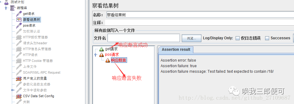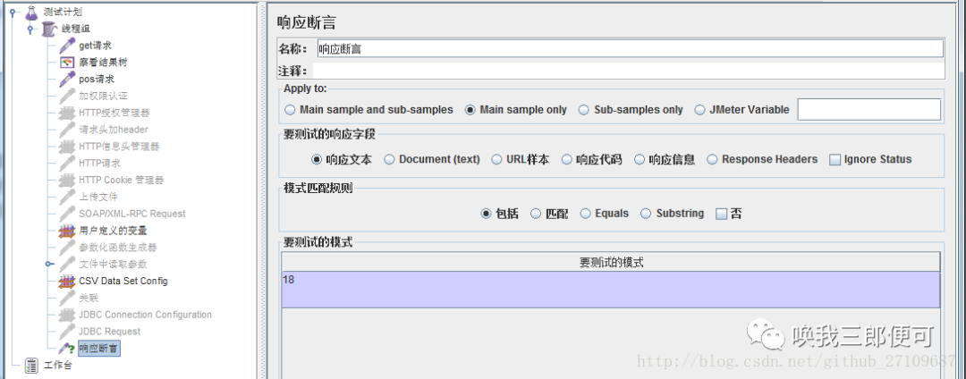 jmeter断言用来检测响应返回的结果和我们预期的是否一致。若针对整个线程组的话,则在线程组下添加断言-响应断言;若只是针对某个请求的话,则在请求下添加断言-响应断言。