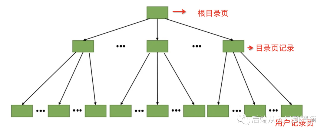 这时候就出现两个以上的目录记录页,而目录记录页之间也是file header用file_page_prev和file_page_next组成双向链,这时候他们也不可能挨着,怎么根据查询的组件定位我们需要的目录记录页呢,这时候会生成更高级的目录页‘根目录页‘。这时候树就成立了,如图所示,倒着看是不是很像一颗枝叶茂盛的数。