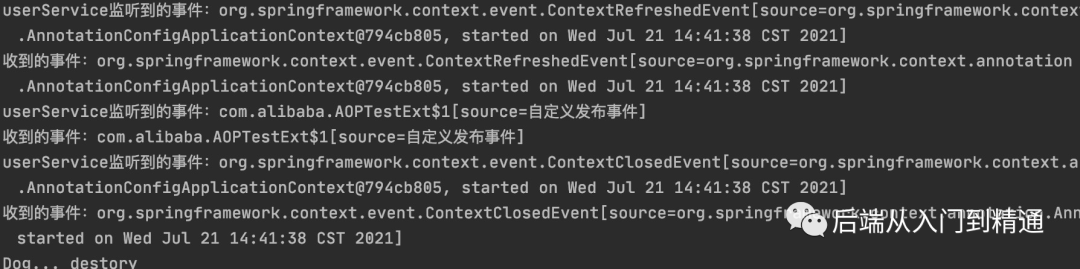@Testpublic void test() {AnnotationConfigApplicationContext applicationContext = new AnnotationConfigApplicationContext(ExtConfig.class);applicationContext.publishEvent(new ApplicationEvent("自定义发布事件") {});/* MyApplicationEvent myApplicationEvent = new MyApplicationEvent("123");applicationContext.publishEvent(myApplicationEvent);*/applicationContext.close();}