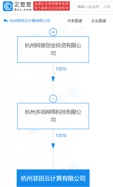 杭州菲田云计算有限公司成立,该公司由杭州多项网络科技有限公司100%控股,后者为杭州阿里创业投资有限公司全资子公司。