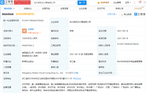 企查查APP显示,8月18日,杭州菲田云计算有限公司成立,法定代表人为赵营苗,注册资本1亿元人民币,经营范围包含:第一类增值电信业务;第二类增值电信业务;广告制作等。