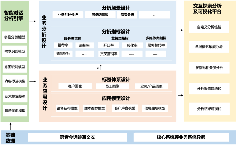 业务应用设计模块针对具体的场景需求进行建模。以智能对话分析引擎和业务分析设计模块的输出物为输入,输出场景化分析应用结果。
