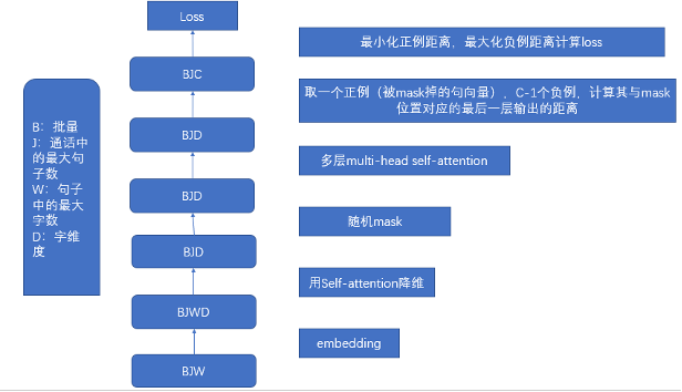 5)取一个正例(被mask掉的句向量),C-1个负例,计算其与mask位置对应的最后一层输出的距离:距离用点积的负数定义。所以应当最大化正例的点积,最小化负例的点积。在本例中的做法是将点积当作特征函数,然后计算出交叉熵最为模型的损失。