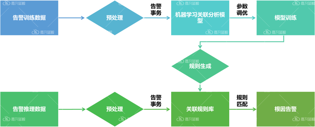 然后选择合适的告警关联分析算法,对告警事务数据进行训练,通过对模型的参数调优,生成告警关联规则并得到关联则库;