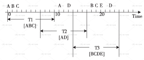 告警事件,即每次故障事件所产生的一系列告警的集合,这是算法输入的必要形式,一般采取滑动时间窗的形式生成告警事件,滑动时间窗步长的取值可以根据告警的实际情况按告警事件的时间分布,取90分位数。告警事件的质量和数量与滑动窗口宽度和步长的设置息息相关,而告警事件作为算法的输入则对算法的效果起到重要的作用。如下图示例:ABCDE为告警数据,滑动窗口宽度为12,步长为7 ,通过3个滑动窗口分别得到了 3个告警事件[T1,T2,T3]。