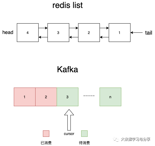 redis list中另一个大问题是rpop会删除数据,所以kafka的解决办法也很简单,不删就行了嘛。kafka用游标(cursor)解决这个问题。