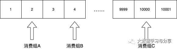 这里需要引入一个消费组的概念,这个概念非常简单,因为消费组本质上就是一组游标。对于同一个topic,不同的消费组有各自的游标。监控组的游标指向第二条,BI组的游标指向第4条,trace组指向到了第10000条……各消费者游标彼此隔离,互不影响。