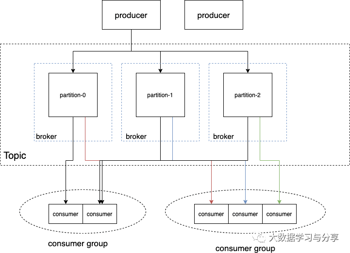 从这个图里我们可以看出,topic是一个逻辑上的概念,不是一个实体。一个topic包含多个partition,partition分布在多台机器上。这个机器,kafka中称之为broker。(kafka集群中的一个broker对应redis集群中的一个实例)。对于一个topic,可以有多个不同的消费组同时进行消费。一个消费组内部可以有多个消费者实例同时进行消费,这样可以提高消费速率。