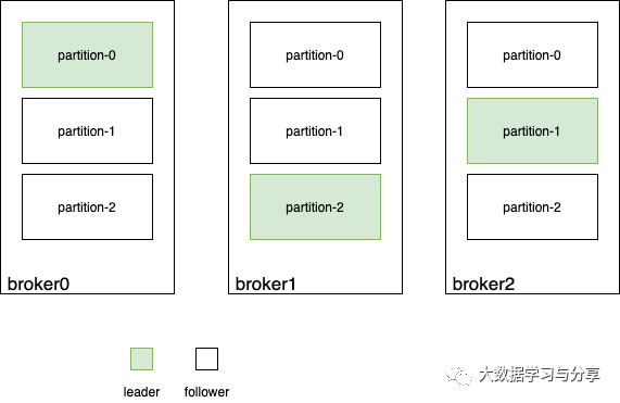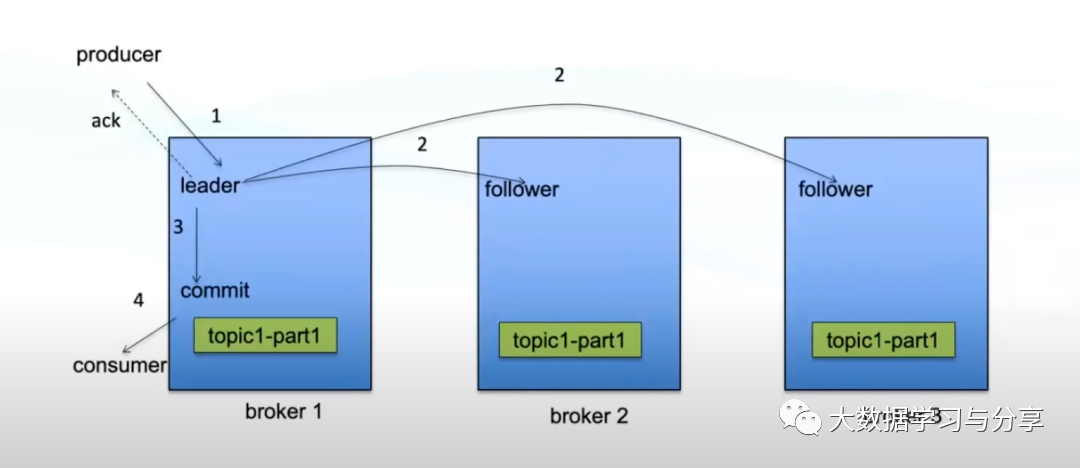系统要容忍丢数据,最朴素也是唯一的办法就是做备份,让同一份数据复制到多台机器,所谓的冗余,或者说多副本。为此,kafka引入 leader-follower的概念。topic的每个partition都有一个leader,所有对这个partition的读写都在该partition leader所在的broker上进行。partition的数据会被复制到其它broker上,这些broker上对应的partition就是follower: