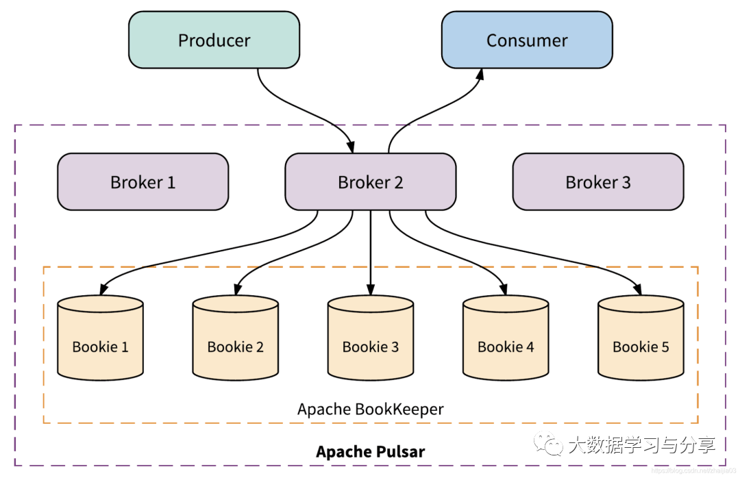 pulsar利用bookeeper作为存储服务,剩下的是计算层。这其实是目前非常流行的架构也是一种趋势,很多新型的存储都是这种”存算分离“的架构。比如tidb,底层存储其实是tikv这种kv存储。tidb是更上层的计算层,自己实现sql相关的功能。还有的例子就是很多"持久化"redis产品,大部分底层依赖于rocksdb做kv存储,然后基于kv存储关系实现redis的各种数据结构。