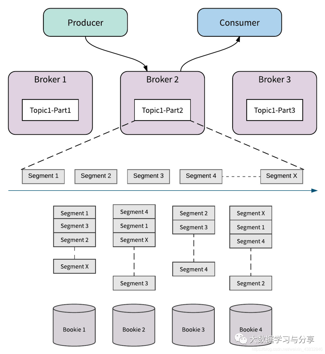 如上图所示,parition被分为了多个segment,每个segment会写入到4个bookie其中的3个中。比如segment1就写入到了bookie1,2,4中,segment2写入到bookie1,3,4中…