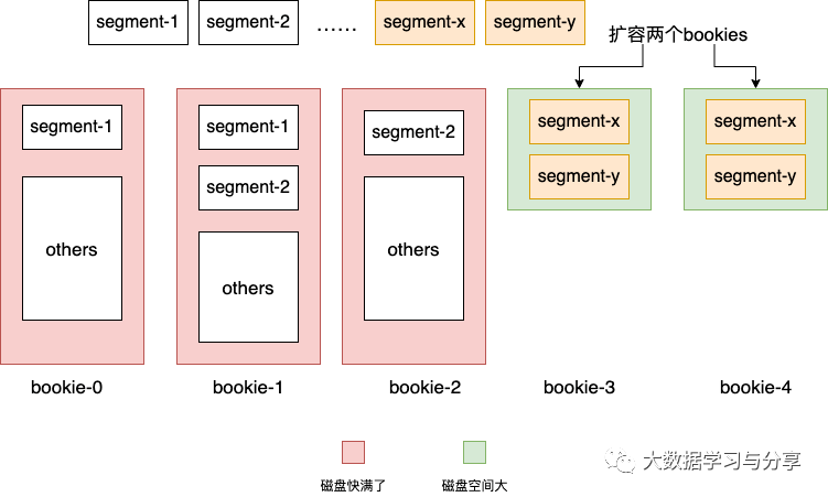 由于partition以segment为粒度均匀的分散到bookeeper上的节点上,这使得存储的扩容变得非常非常容易。这也是Pulsar一直宣称的存算分离架构的先进性的体现: