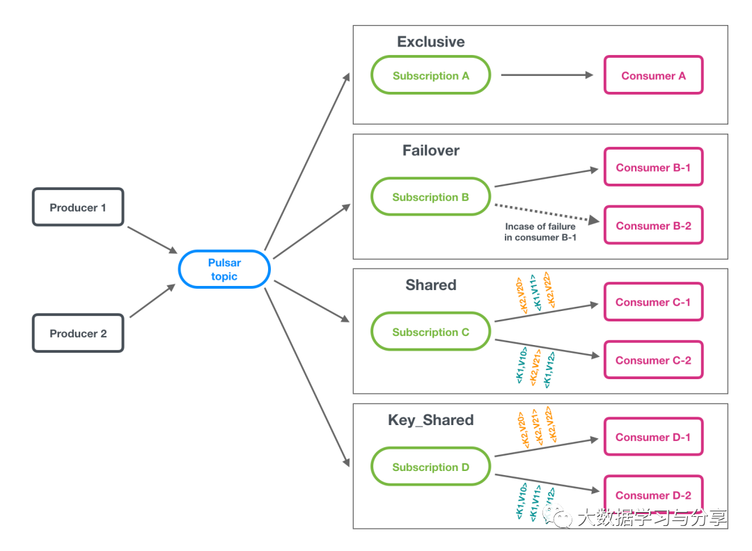 可以把pulsar的subscription看成kafka的consumer group,但subscription更进一步,可以设置这个”consumer group“的消费类型:
