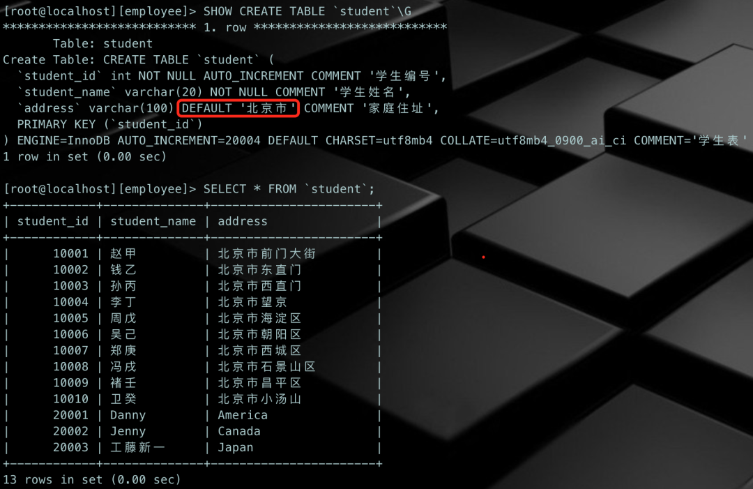 [root@localhost][employee]> ALTER TABLE `student` MODIFY `address` VARCHAR(100) DEFAULT '北京市' COMMENT '家庭住址';