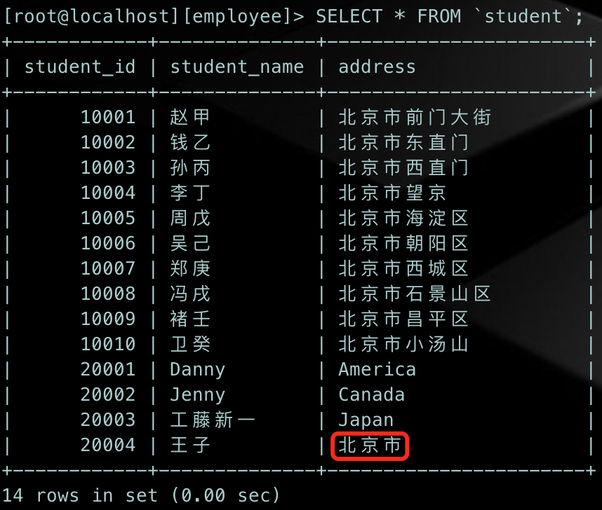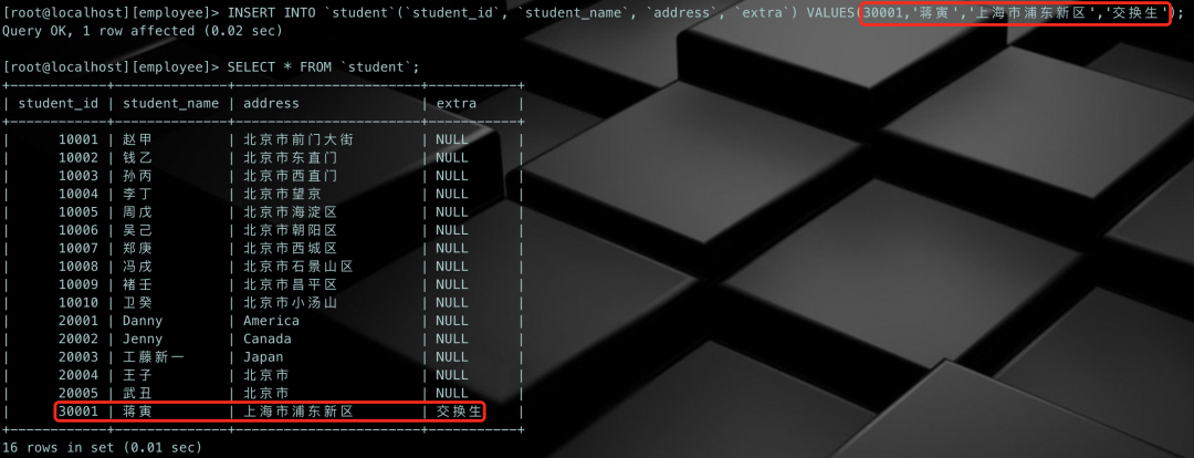 [root@localhost][employee]> INSERT INTO `student`(`student_id`, `address`, `extra`) VALUES(30003,'上海市徐汇区','交换生');