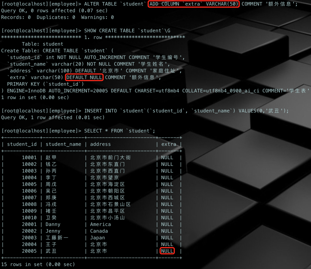 细心的你可能会发现一个现象,使用DDL语句调整字段的默认值时,不会对表中已有数据做修改,并且新增字段也不会对原始数据做修改,插入数据如果指定具体值的话,会按照指定的值进行保存: