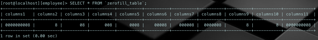 `columns8` INT(7) UNSIGNED ZEROFILL,