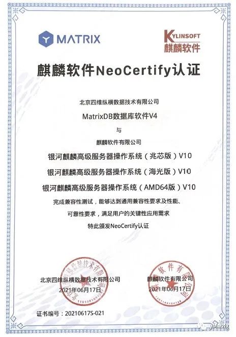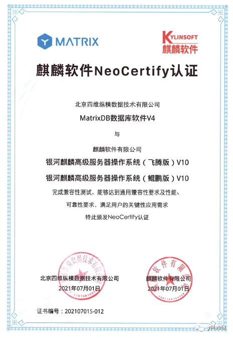 双方将在能源、电力、工业互联网等行业成为合作伙伴,实现四维纵横相关技术平台基于银河麒麟操系统上的迁移适配,双方携手打造能源、电力、工业互联网等行业的KyOS+MatrixDB标杆案例。MatrixDB 4.0现已完成了Kylin V10的NeoCertify认证。
