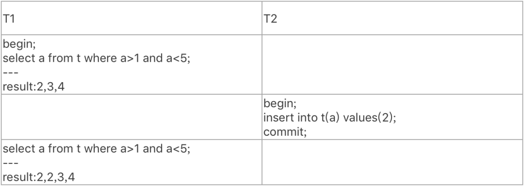 翻译一下:事务 T1 读取一组满足某些 <搜索条件> 的数据。事务 T2 创建了满足 T1 的 <搜索条件> 的数据项并提交。如果 T1 用相同的<搜索条件>再次读取,得到一组不同于第一次读取的数据。这就叫幻读。