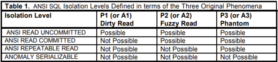 Phantom Rows:https://dev.mysql.com/doc/refman/8.0/en/innodb-next-key-locking.html A Critique of ANSI SQL Isolation Levels:https://www.microsoft.com/en-us/research/wp-content/uploads/2016/02/tr-95-51.pdf A Critique of ANSI SQL Isolation Levels 论文翻译:https://www.pianshen.com/article/2443612904/ A Critique of ANSI SQL Isolation Levels 论文阅读:https://www.pianshen.com/article/51371657923/ ANSI SQL-92:http://www.contrib.andrew.cmu.edu/~shadow/sql/sql1992.txt?spm=a2c6h.12873639.0.0.632c6c50gWGMa2&file=sql1992.txt