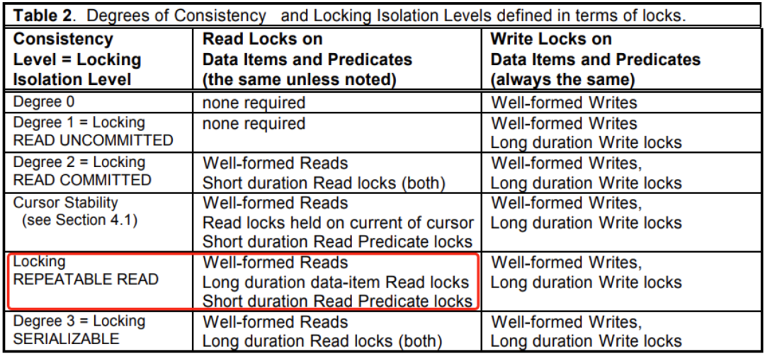 Date 和 IBM 最初使用名称“Repeatable Reads”[DAT,DB2]表示可串行化或锁可串行化。这似乎是一个比[GLPT]术语“隔离度3”更易理解的名称,尽管它们是相同的。可重复读的 ANSI SQL 含义与 Date 的原始定义不同,我们认为这是不幸的。Phenomena P3 是 ANSI SQL 可重复读隔离级别不考虑的,但从 P3 的定义可以看出,读取是不可重复的!(译者注:P3 违反了“可重复读”中文词义)我们在表2中仍然误用“锁可重复读”术语,来对应 ANSI 定义。
