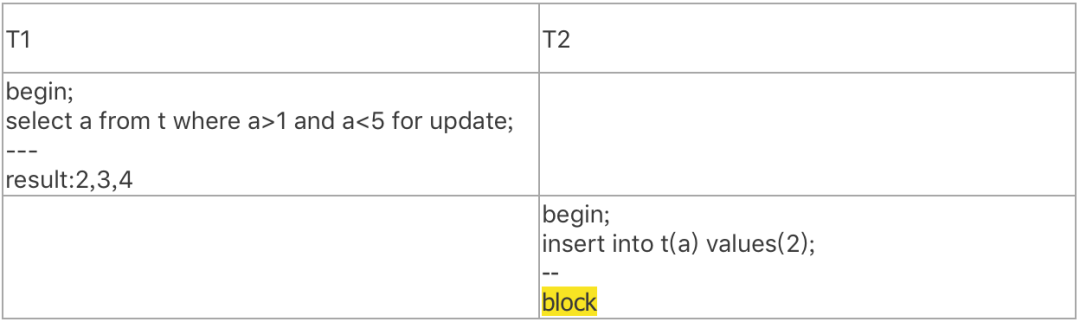 问题2中描述了为什么 ANSI repeatable-read 允许幻读的原理:因为事务T1的读只对满足条件的数据行加锁,而事务T2插入的位置是数据行之间的间隙,不会被阻塞。在 MySQL repeatable-read 的实现中,当前读的加锁范围是数据行+间隙,所以事务T2的插入会被阻塞,T1的两次当前读结果不会变。举个简单例子: