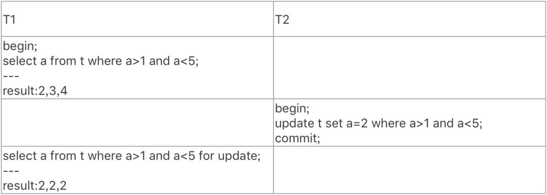如果把 T2 执行的 SQL 换成 update t set a=2 where a>1 and a<5