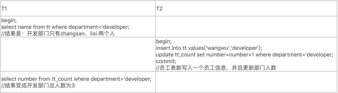 事务2增加新雇员并更新雇员总数z,事务1在事务2提交前后读取到了破坏雇员列表与雇员总数的一致性的数据。因为事务1并未重复读取谓词P指定的数据集合,H3的行为并不符合A3的形式化定义,所以A3只能算是一种严格意思上的幻读,所以论文补充了幻读这一异常现象的宽松解释。
