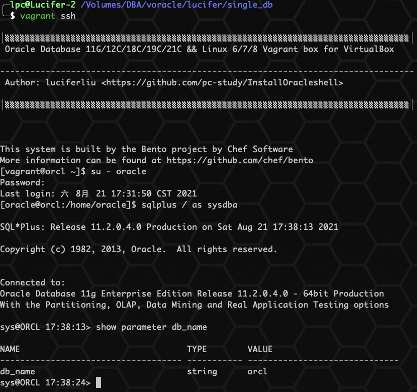 2、使用 vagrant ssh 来连接,注意要在 single_db 目录下执行,连接进去是 vagrant 用户,使用 su - oracle 来切换即可。