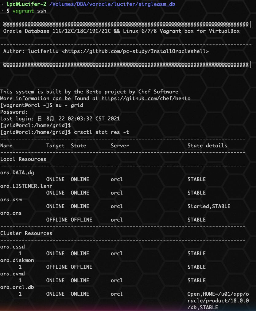 2、使用 vagrant ssh 来连接,注意要在 singleasm_db 目录下执行,连接进去是 vagrant 用户,使用 su - oracle 来切换即可。